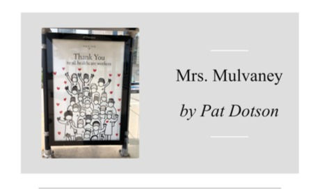 During the isolation of Covid-19, I wrote a short story that featured Mrs. Mulvaney, an elderly lady who resided in an assisted living facility. The story was published in the literary journal,